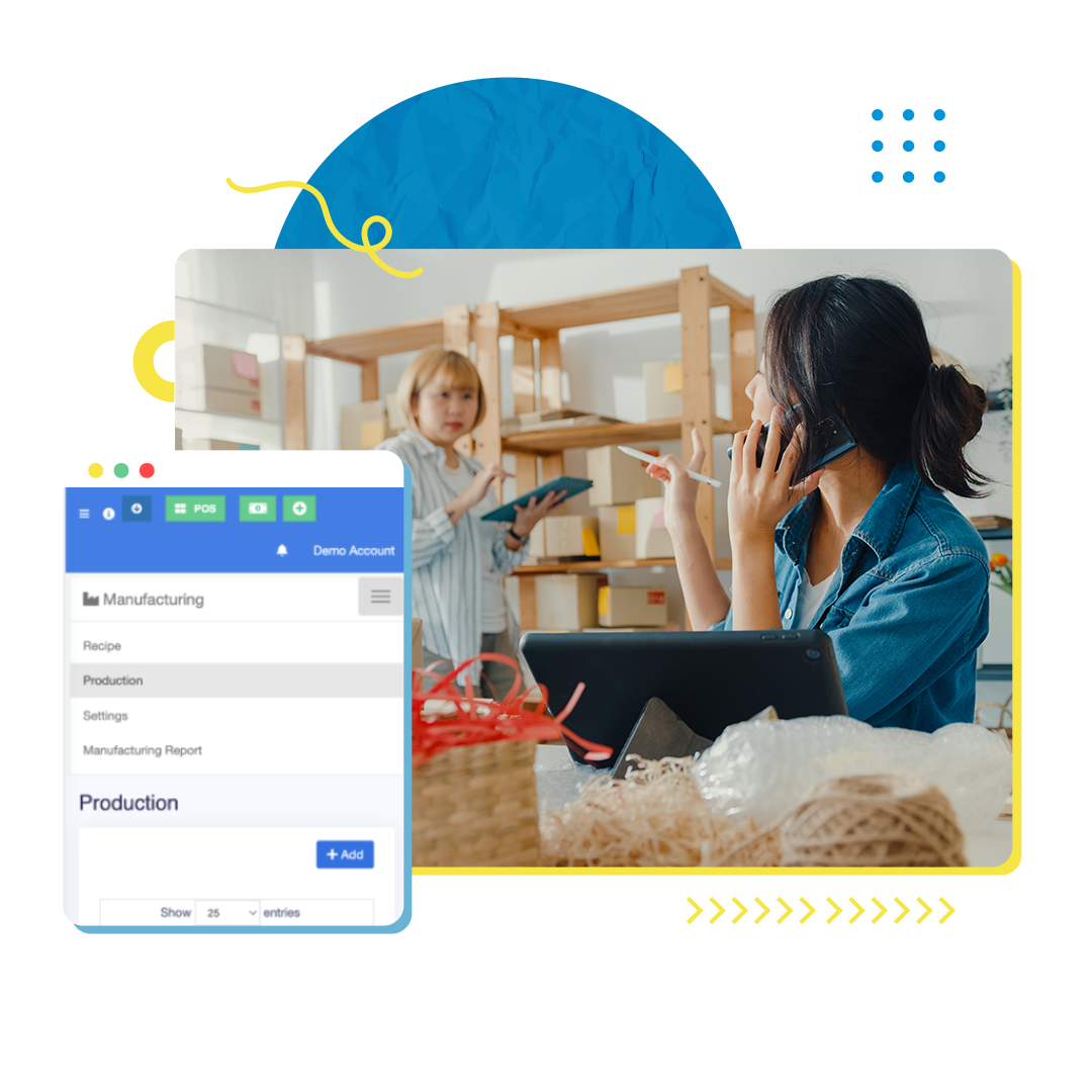 Dilengkapi manajemen inventori yang memudahkan user mengetahui jumlah detail setiap bahan baku yang dimiliki untuk proses produksi.