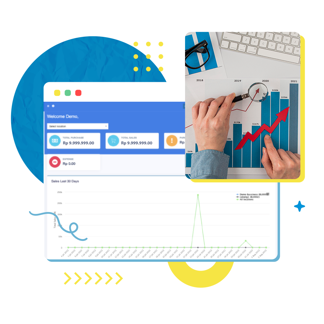 Pada menu utama dalam dashboard terdapat grafik analisa yang berisi laporan penjualan seperti pendapatan harian hingga laporan keuangan tahunan. Serta, menganalisa penjualan dan stok di toko, cabang, atau kantor pusat.